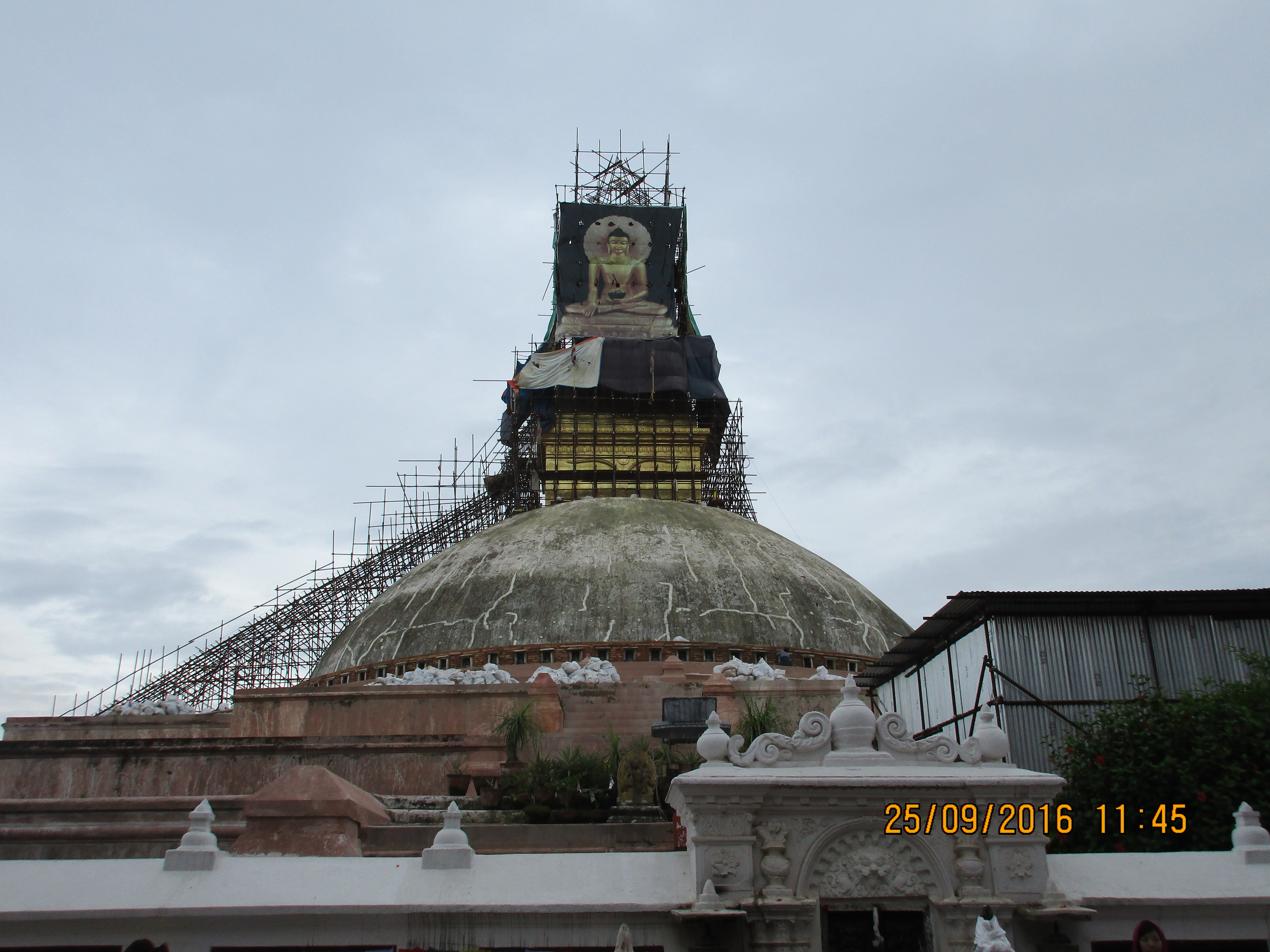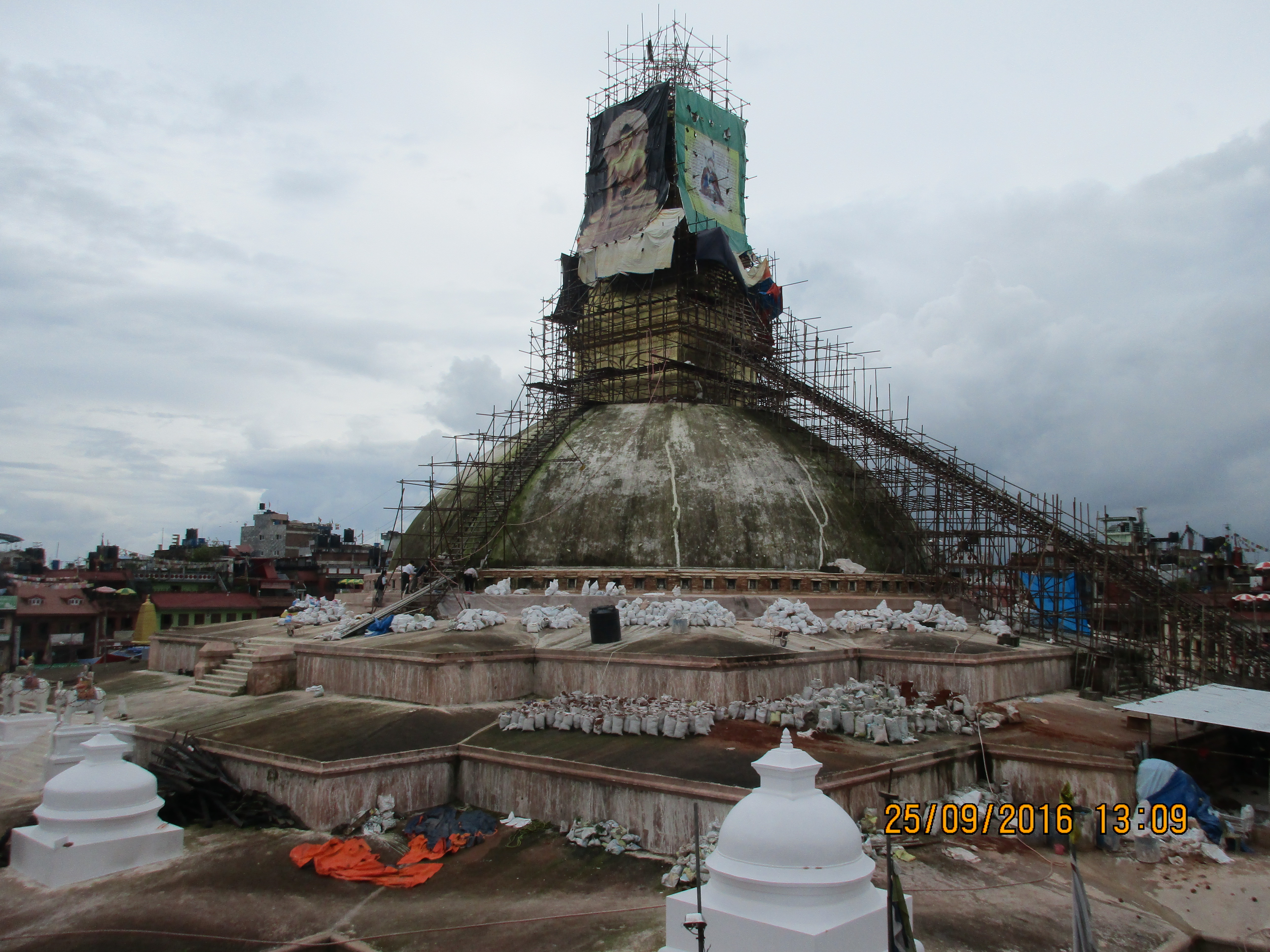 Circa 6-7 km nordöstlich vom Zentrum Kathmandus steht die große Boudha Stupa. Da sie während dem Erdbeben einige Schäden erlitten hat, wird momentan noch fleißig daran gearbeitet.