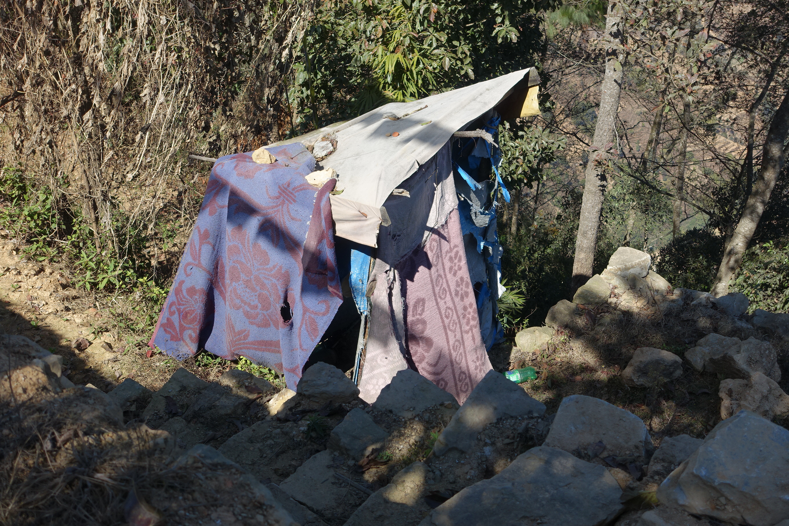 Hier oben gibt es nichts. Kein Wasser, keine Versorgung egal, welcher Art. Der nächste Ort ist im Tal, weit unten, die Wege schmal und holperig. Die Menschen versorgen sich weitestgehend selbst. Dafür gab es Bananen- und Apfelbäume, Bambusrohr. Hanf gab es nicht. Normalerweise dient das, was bei uns als Marihuana verboten ist, hier als Viehfutter. Doch im Winter wächst es nicht. Die Felder waren umgepflügt.