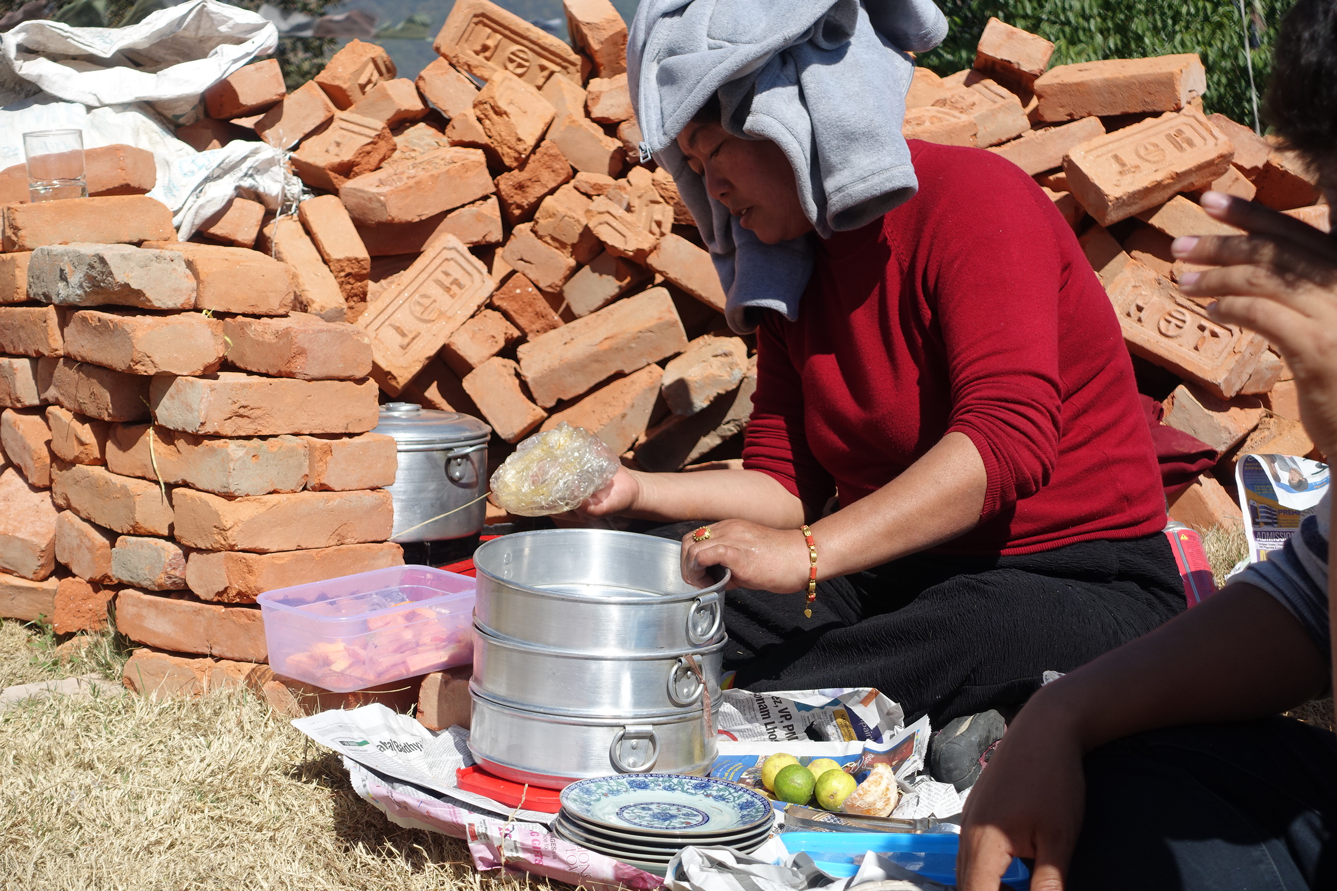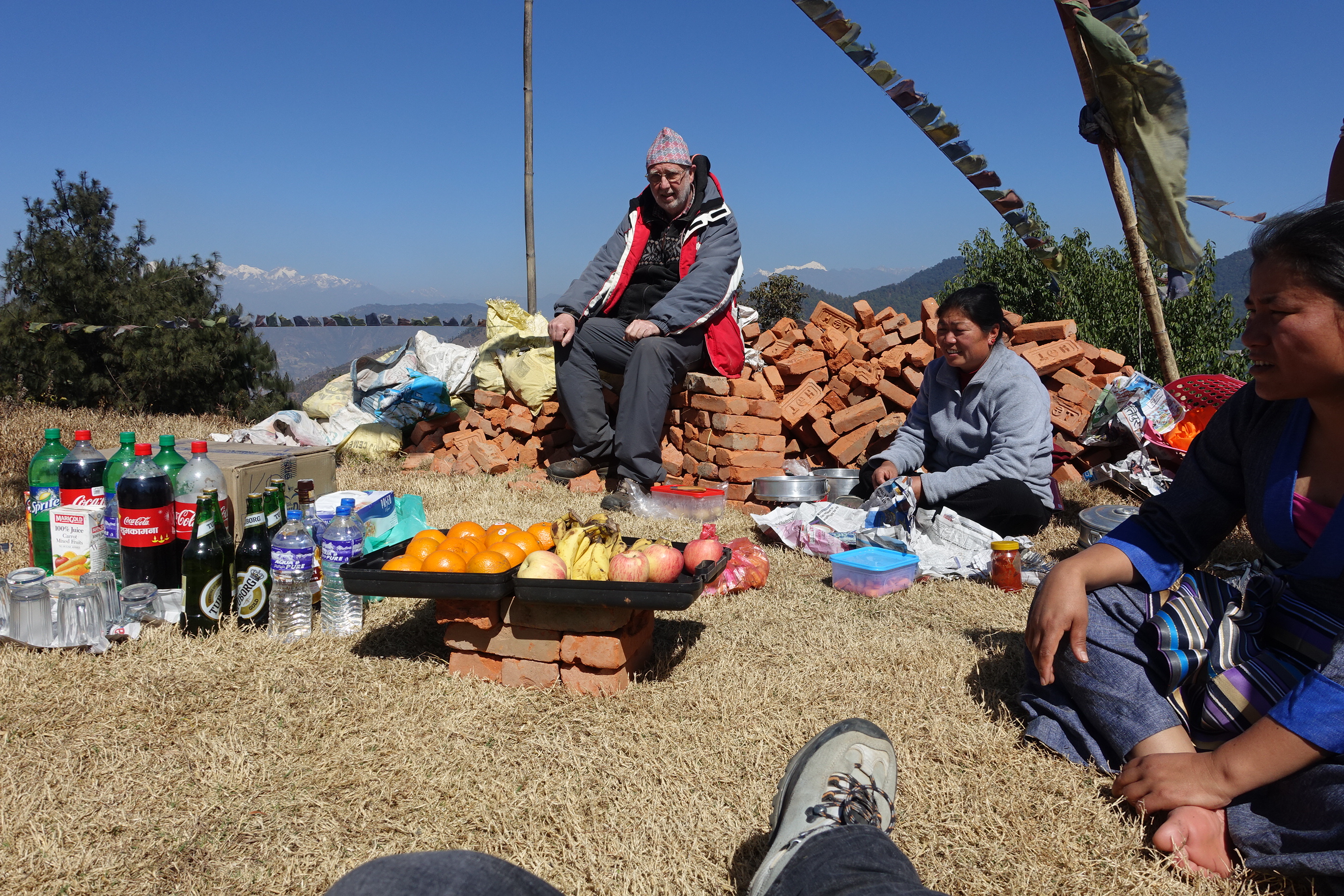 Der Bus ist mindestens so geländetauglich wie der Jeep vom Freitag, die Straßen in Katmandu kaum besser als in den Bergen und dann ging es bergauf. Oben angekommen packte Chengas Familie aus, was sie mitgebracht hatte, Essen und Getränke mit Besteck und Geschirr einem kleinen Gasherd und Teppichen, auf denen wir sitzen konnten. Das Grundstück gehört Chenga. Ganz oben ist es und auch hier hat das Erdbeben ordentlich gewütet und Häuser zum Einstürzen gebracht. Chenga hatte kurzerhand Zelte aufgebaut und auf seinem kleinen Stück Land für 400 Kinder, die beim Erdbeben ihre Eltern verloren hatten, eine Unterkunft geschaffen.