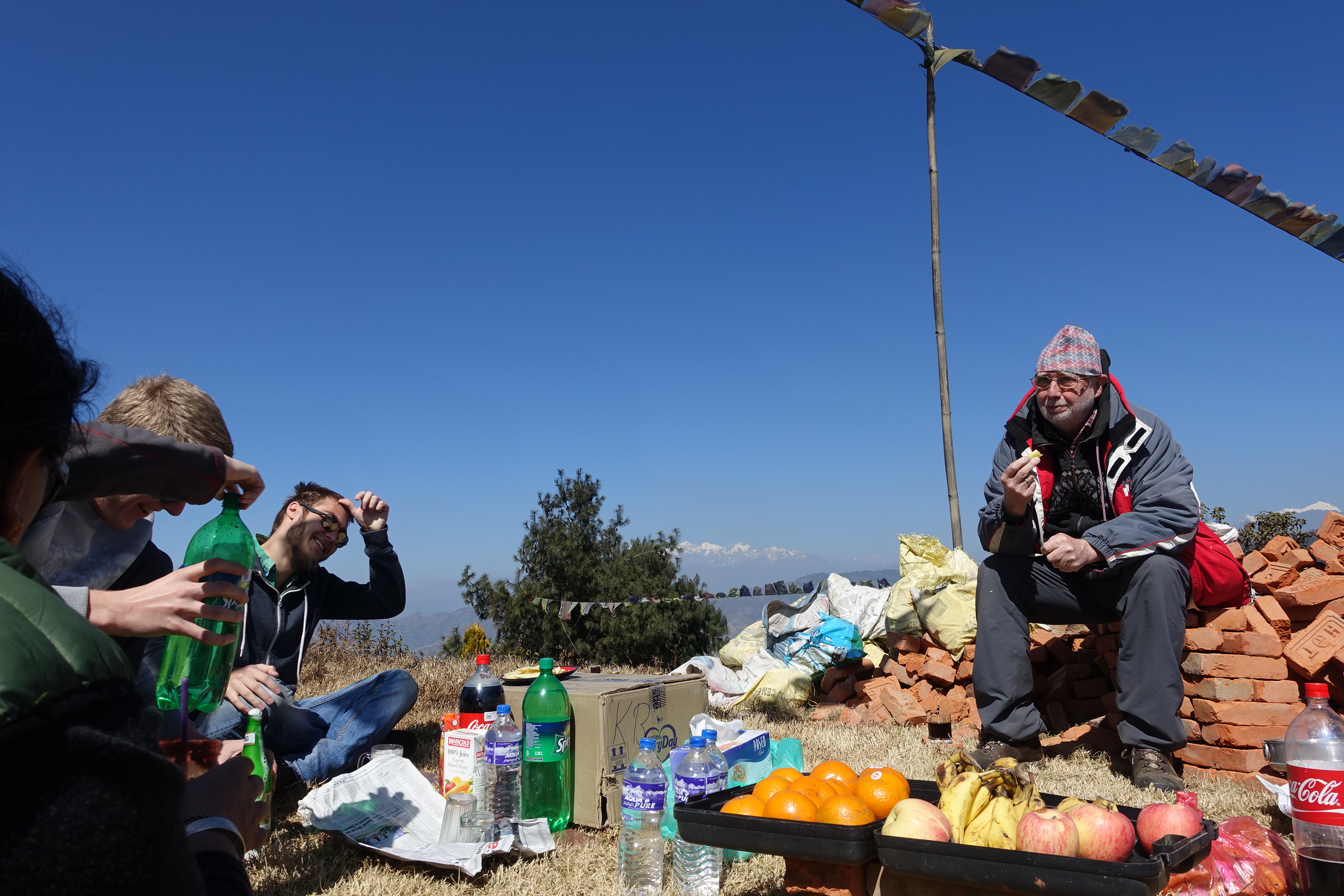 Der letzte Tag. Morgens um 11 Uhr wollten wir los. Karle, unser Fahrer, holte uns ab. Nein, sicherlich heißt er ein bisschen anders, aber der Name klingt genau wie Karle. Und Karle ist einfach auch ein guter Name für einen Fahrer. Thinley kam mit und Pema, unsere Reisegruppe aus Deutschland – Gabi, Adolf, Tim, Martin, Judith und ich. In Chengas Bus ist Platz für zwölf Personen. Für zwölf Personen und Cola, Fanta, Sprite, Bier, Rum, Kekse, Tee, Kochgeschirr, Torte, Mo-Mo, was die Nepali-Variante unserer Maultaschen sind, Möhren, Mandarinen, Bananen und Nudelsuppe mit Gemüse. Dazu die Köchin – Pemas Schwester, die auch Pema heißt, Chenga, Tensing und die Tante, deren Namen ich mir bisher noch nicht merken konnte.