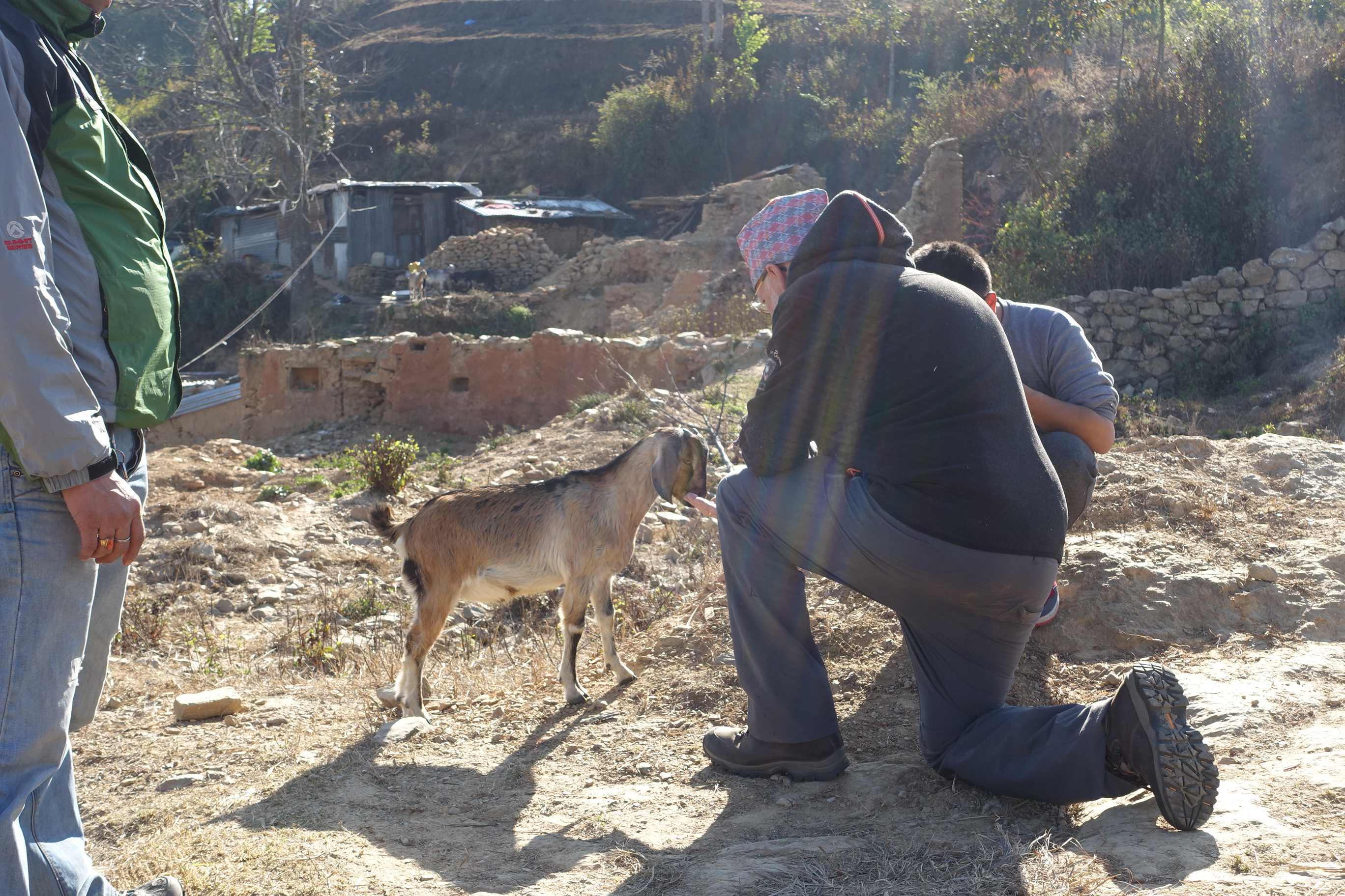 Der Ausblick von hier oben war einfach gigantisch, Ehrfurcht einflößend. Ich fühlte mich, wie auf dem Dach der Welt. Rings um uns her schneebedeckte Gipfel in 6000, 7000 und 8000 Metern Höhe. Und dazu noch jede Menge grüner Berge. Wir sind ein Stück gelaufen, an eingefallenen Bauernhäusern vorbei, an denen gearbeitet wurde, damit Mensch und Vieh, Ziegen, Kühe, Hunde wieder ein Dach überm Kopf haben sollten.