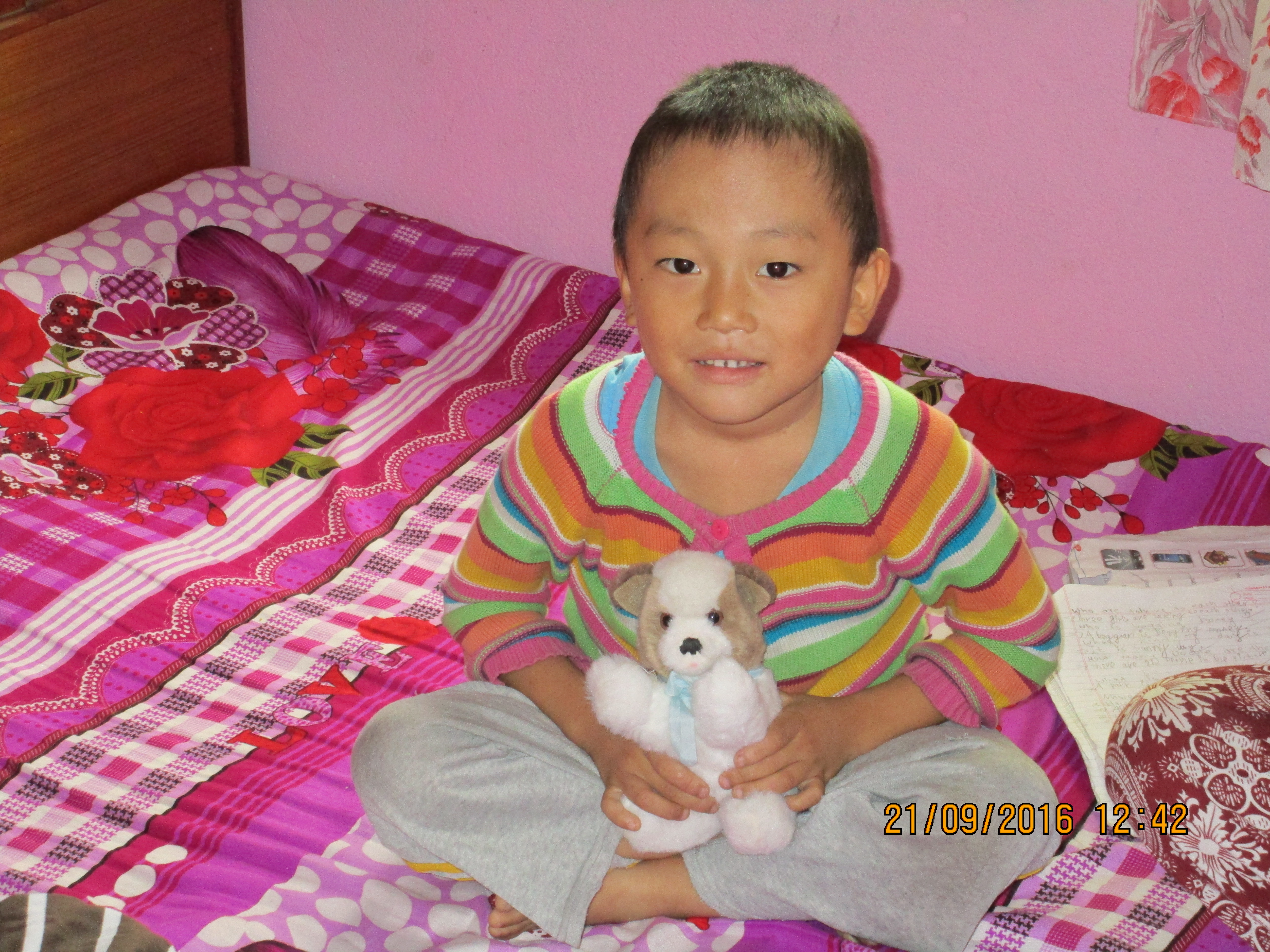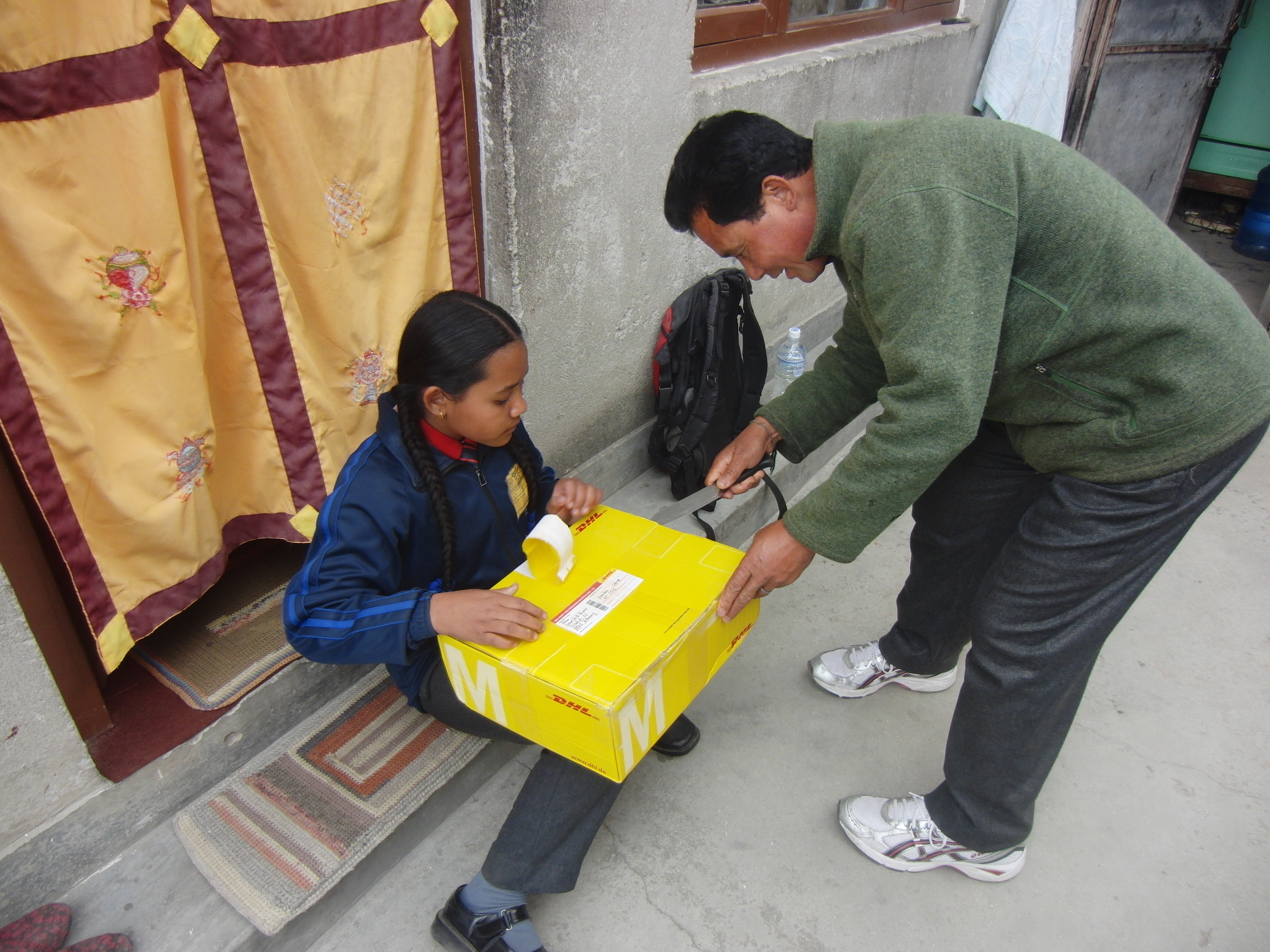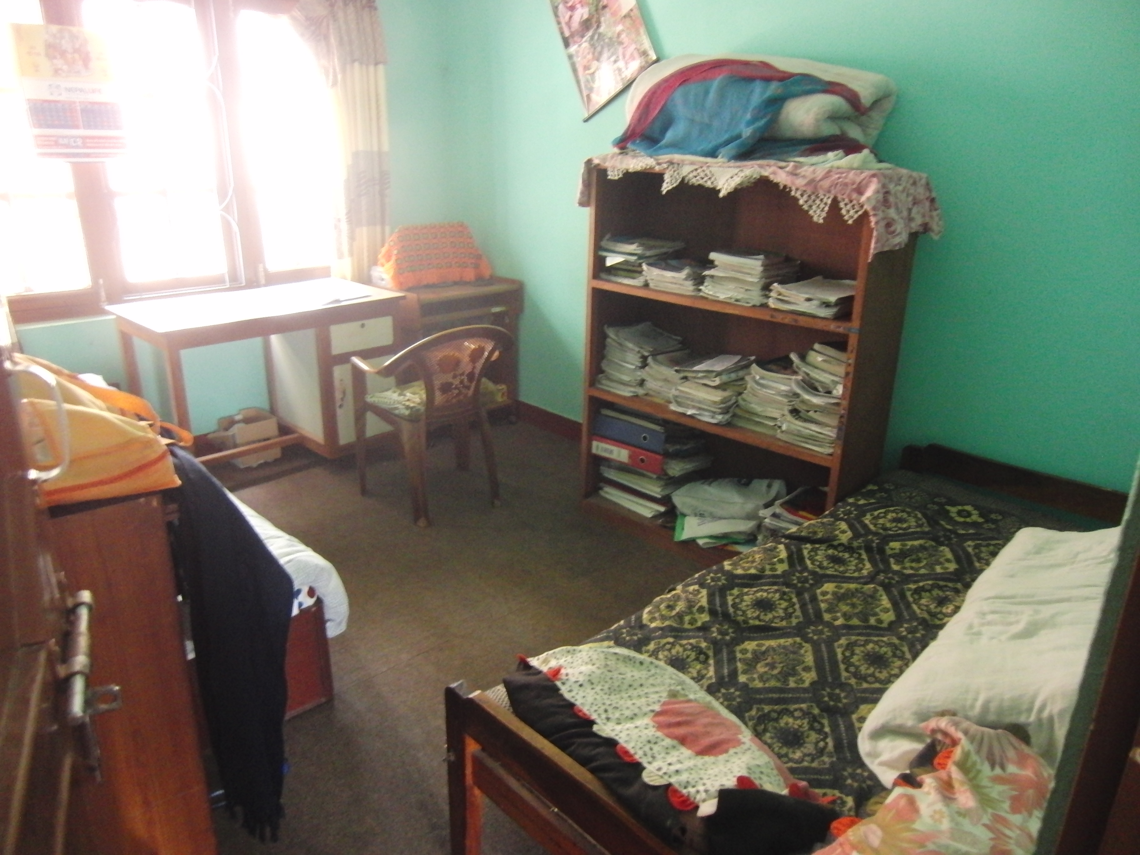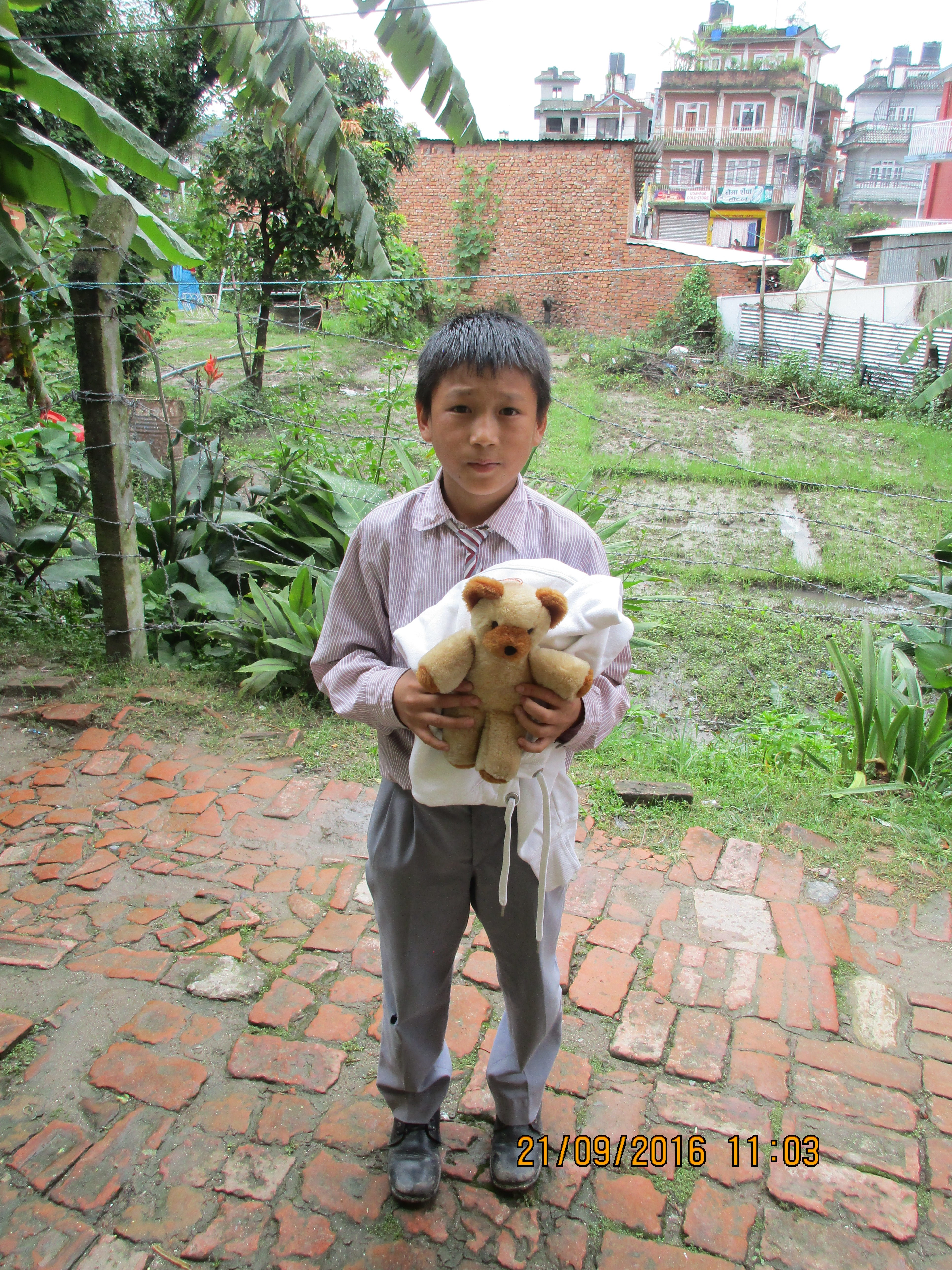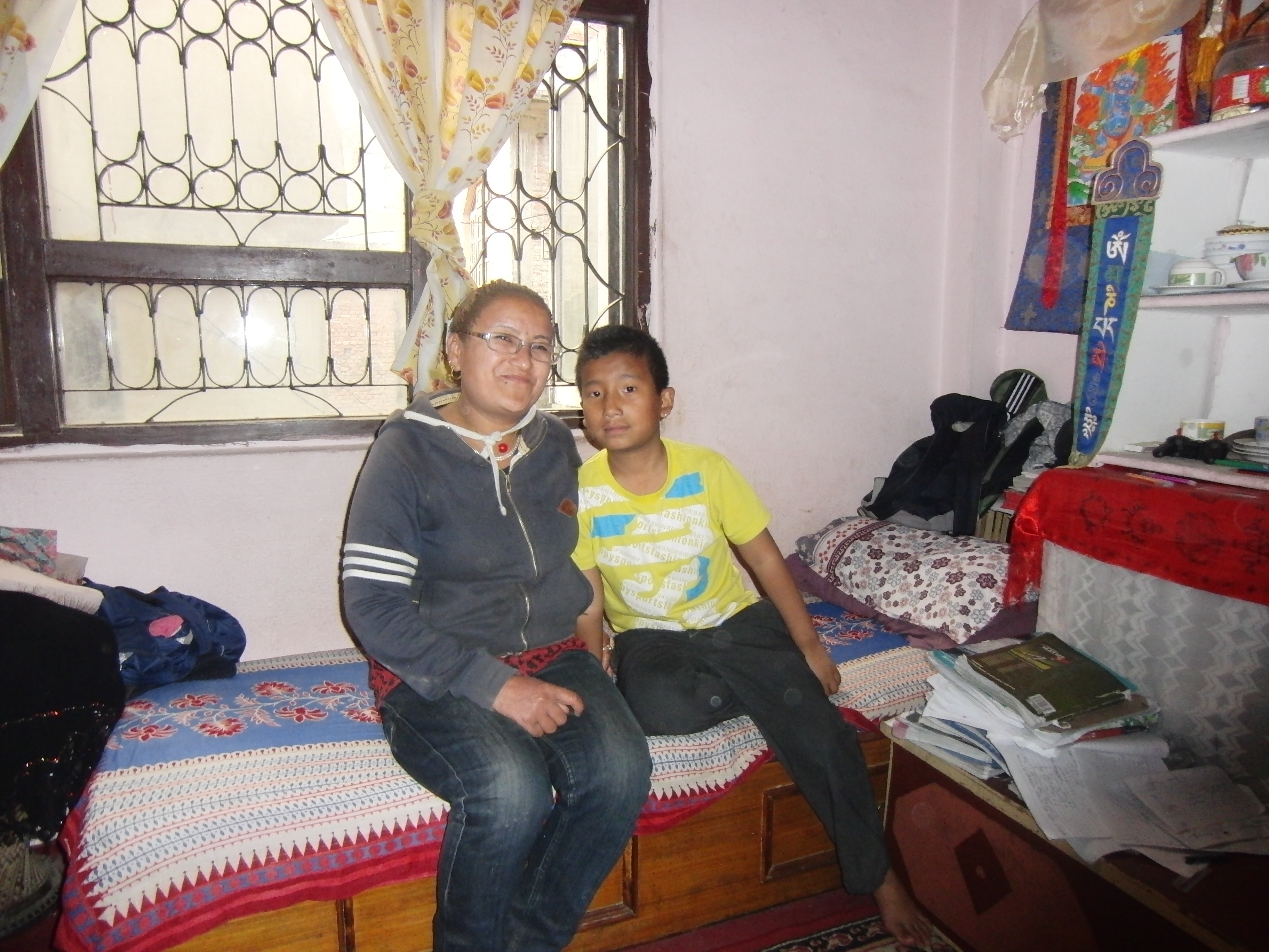 Ich habe 2 Patenkinder besucht. Beide leben jeweils zusammen mit ihrer Tante ungefähr 30-50 Minuten von Swayambhunath entfernt. Nach einer holprigen und matschigen Motorradfahrt mit Ras (Reiseleiter) kamen wir zuerst bei Prem Kumar an. Er war gerade im Aufbruch in die Schule zu gehen. Die Tante war sehr gastfreundlich und hat uns auf Nepali-Tee und Kekse hereingebeten. Die Zimmer waren zwar einfach und klein, dennoch sehr gemütlich. Anschließend haben wir Niyos etwas außerhalb der Stadt besucht, der uns mit einem schüchternen Lächeln begrüßt hat. Er hatte an diesem Tag keine Schule und war gerade dabei seine Hausaufgaben zu machen. Die beiden Jungs haben sich sehr über Stofftiere und Klamotten aus den Spendenpaketen gefreut. 😉